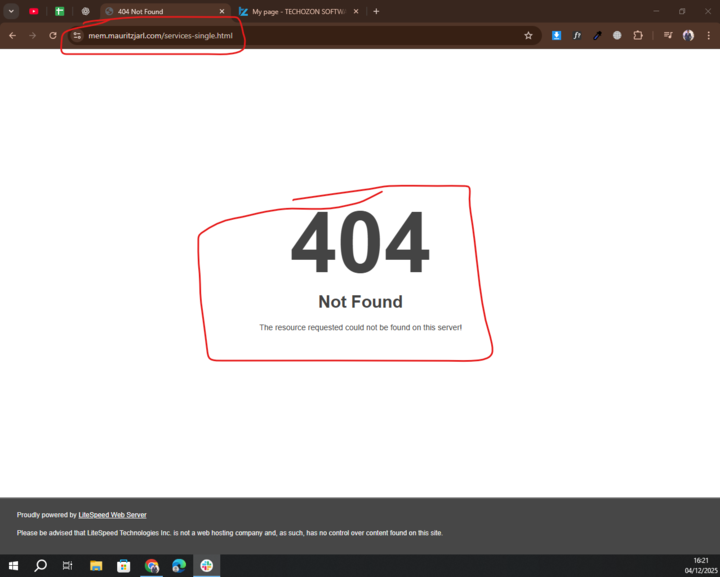 The system shows a 404 Not Found page